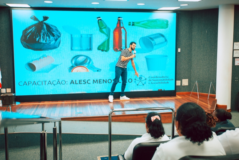Os colaboradores assistiram a uma palestra de Arthur Rancatti, profissional que atua com gestão de resíduos sólidos há 12 anos. Ele explicou detalhes sobre o Programa Alesc Sustentável que prevê, entre outras coisas, a instalação de casas de abelha sem ferrão na Assembleia, compostagem, criação de hortas orgânicas e agenda 3P, uma metodologia do Ministério do Meio Ambiente para órgãos públicos se tornarem mais sustentáveis.