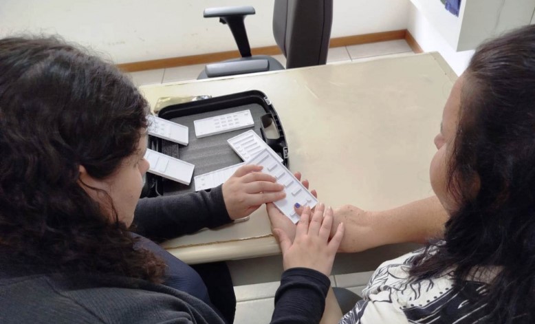 Em vez de reproduzir ícones detalhados, os estudantes optaram por figuras geométricas simples, como círculos, quadrados e triângulos, mais fáceis de identificar com as mãos. As peças foram desenhadas na plataforma Onshape e fabricadas em impressora 3D.