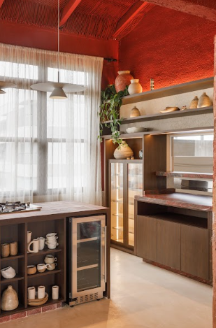 Projetado pela 3P Studio e Lavínia Duzzo, o ambiente Restaurante Kuya’Buka tem sua cozinha integrada a sinuosa parede de alvenaria com acabamento de mistura de terra, cal, argila pigmentada e sisal. Essa parede define a paleta de cores do espaço em tons terrosos, criando um ambiente acolhedor que instiga o paladar e remete às tradições culinárias.