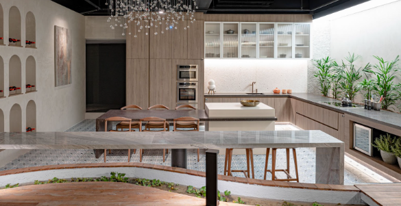 Na busca de proporcionar novas possibilidades de interação entre os usos, o ambiente Casa Concha celebra o poder dos encontros. Assinado pelo escritório IdeaBaln, a cozinha do espaço é composta por uma ilha em mármore Valentina bruto, disposto de forma central e conectando a mesa de jantar e o sofá.