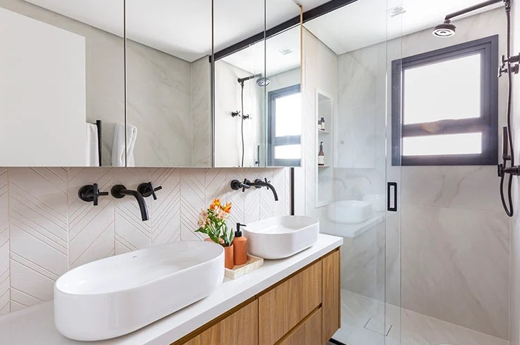 O armário com espelho para banheiro existe em acabamentos, formatos e tamanhos que atendem desde projetos minimalistas até composições mais clássicas. Essa variedade facilita a escolha e ajuda o móvel a se integrar a propostas bem diferentes.