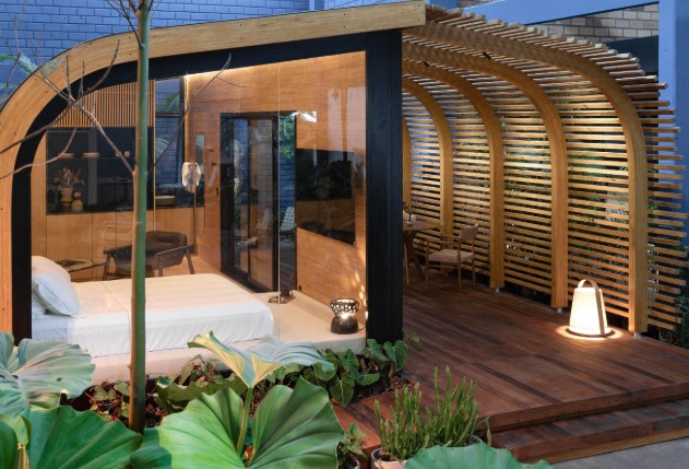 Construída em Camboriú e transportada inteira para o espaço da mostra, a Nuoca é produto da lógica “obra sem obra”: industrializada, resiliente e nômade. Sua varanda e quintal vibrante convidam à permanência em uma arquitetura bioclimática que respeita o vento, a luz e o entorno.