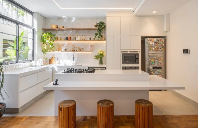 Versátil, esse tipo de layout funciona tanto em cozinhas integradas quanto em espaços fechados. A distribuição permite separar melhor as áreas de preparo, cocção e limpeza, desde que o planejamento seja feito com atenção às necessidades do dia a dia.