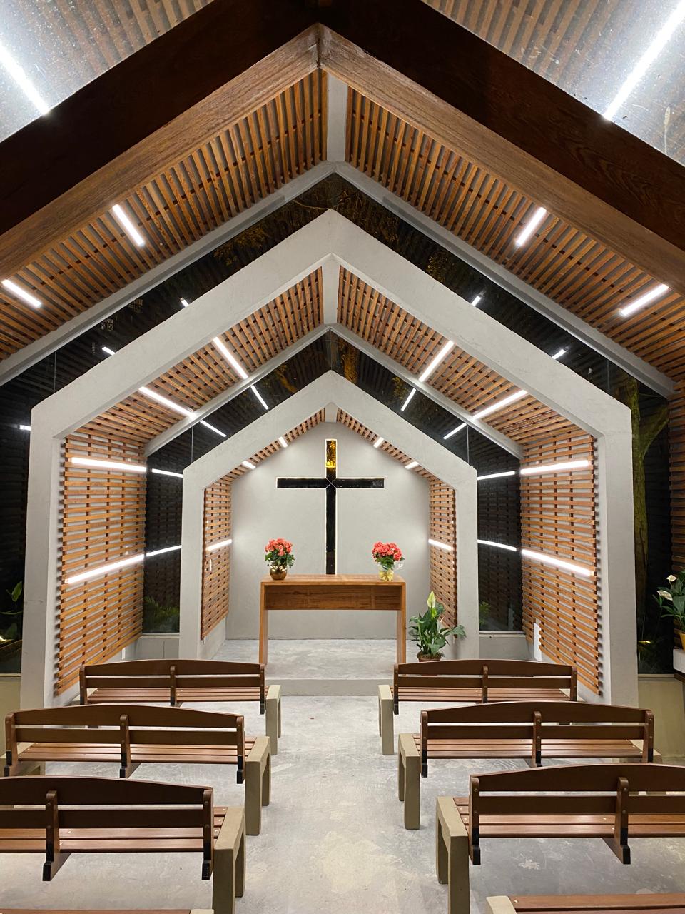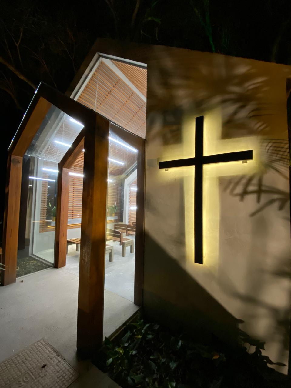 "No projeto da Capela para o Cosão do Santinho, nos foi solicitado uma ideia simples e singela, mas com a força e personalidade inspiradora da D. Iolanda Marcondes. Pensamos em algo elegante, mas discreto. A inspiração veio pela Santíssima Trindade. Em nome do Pai, Filho e Espírito Santo, por isso o formato de três blocos em concreto que se unem em fendas." disse Mário Pinheiro.