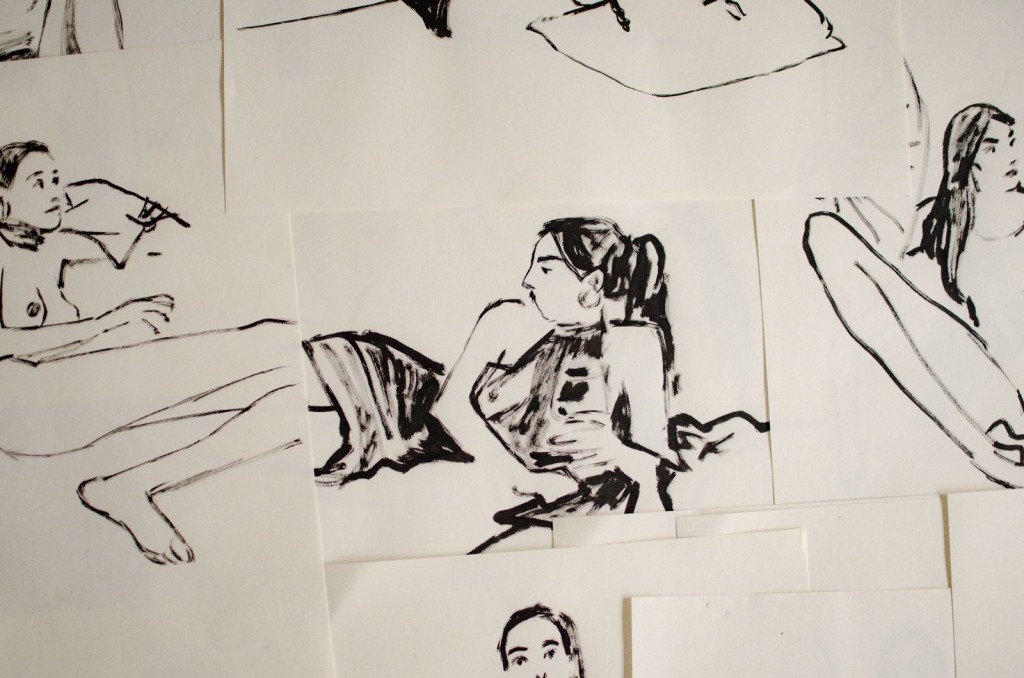 “369 Segundos” nasce do processo das sessões mediadas por Lesse, em que quem modela permanece no centro da sala, em formato de arena, enquanto quem desenha registra o que veem e o que projetam naquela cena. Gabi explica que quem modela escolhe uma postura, uma expressão e uma intenção, e então permanece imóvel. Cada desenhista, de seu próprio ângulo, expressa o que consegue ver, tanto de forma objetiva quanto a partir do que mais chama sua atenção ou do que acaba projetando naquele modelo. “São 360 segundos de rodada e, claro, aqueles 9 segundos a mais para um último retoque ou olhar”, destaca.