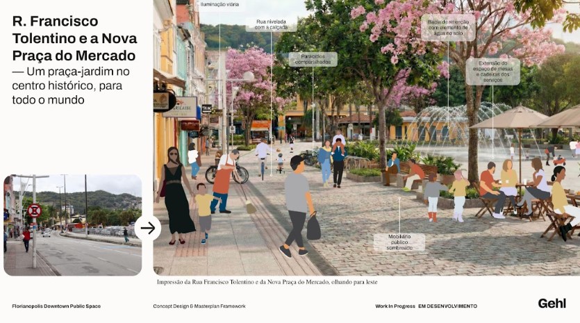 Estudo preliminar elaborado com a Gehl Architects propõe intervenções no Mercado Público, rua Esteves Júnior e Beira-Mar Norte