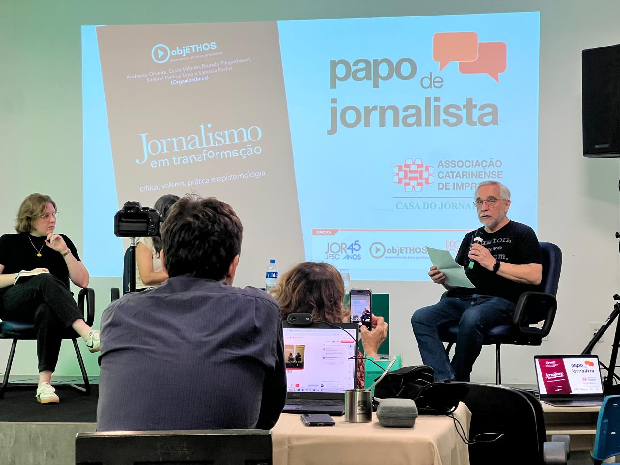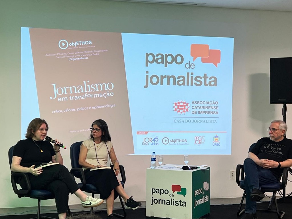A Associação Catarinense de Imprensa (ACI), em parceria com o Observatório da Ética Jornalística (objETHOS) da Universidade Federal de Santa Catarina (UFSC), realizou na noite de 14 de abril, em Florianópolis, a primeira edição de 2026 do projeto Papo de Jornalista. O encontro ocorreu no auditório da ACI e reuniu profissionais, estudantes e interessados na área para discutir os rumos da profissão.