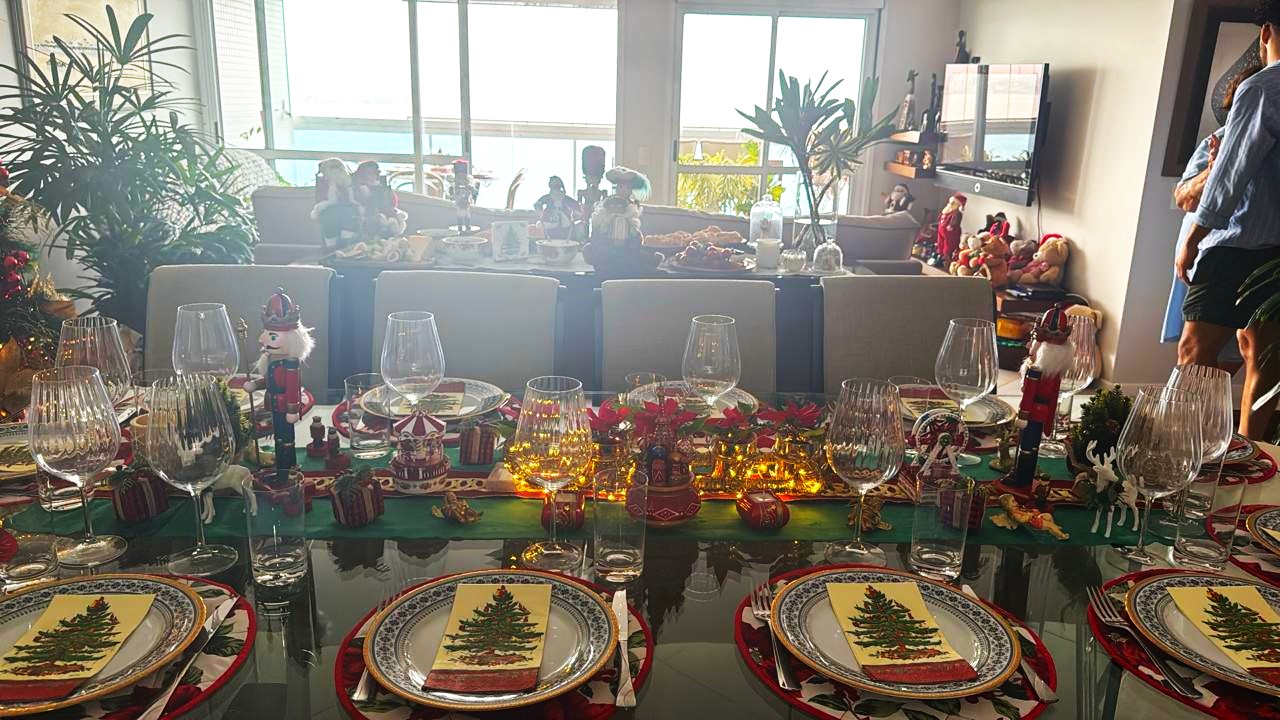 Essa sensibilidade aparece também nas dicas práticas que ela oferece para quem quer montar uma ceia elegante sem exageros. A solução, muitas vezes, está no simples. Galhos, pinheiros, elementos naturais, uma mesa que permita que todos se olhem. Lúcia conta que organiza ceias para cerca de 30 pessoas da família e que esse costume vem desde a infância, quando ganhou o apelido de “Lúcia do laço”, pela paixão em decorar o Natal.