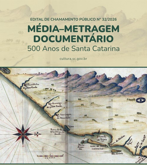 O Governo do Estado de Santa Catarina, por meio da Fundação Catarinense de Cultura (FCC), abre no próximo dia 5 de maio de 2026, as inscrições para edital que irá selecionar um projeto de documentário média-metragem com a temática dos 500 anos da presença e da formação histórica do território de Santa Catarina. As inscrições são gratuitas e deverão ser realizadas e enviadas até as 23h59 do dia 20 de maio de 2026, exclusivamente no formato virtual por meio da plataforma que será disponibilizada em breve no site.