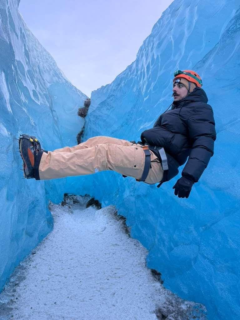 Após pedir em noivado sua amada Céres Albé sob as luzes e cores da aurora boreal, na Islândia, o intrépido Bernardo "Mustache" Soares decidiu escalar uma fenda de gelo para relaxar. (Foto: Acervo pessoal)