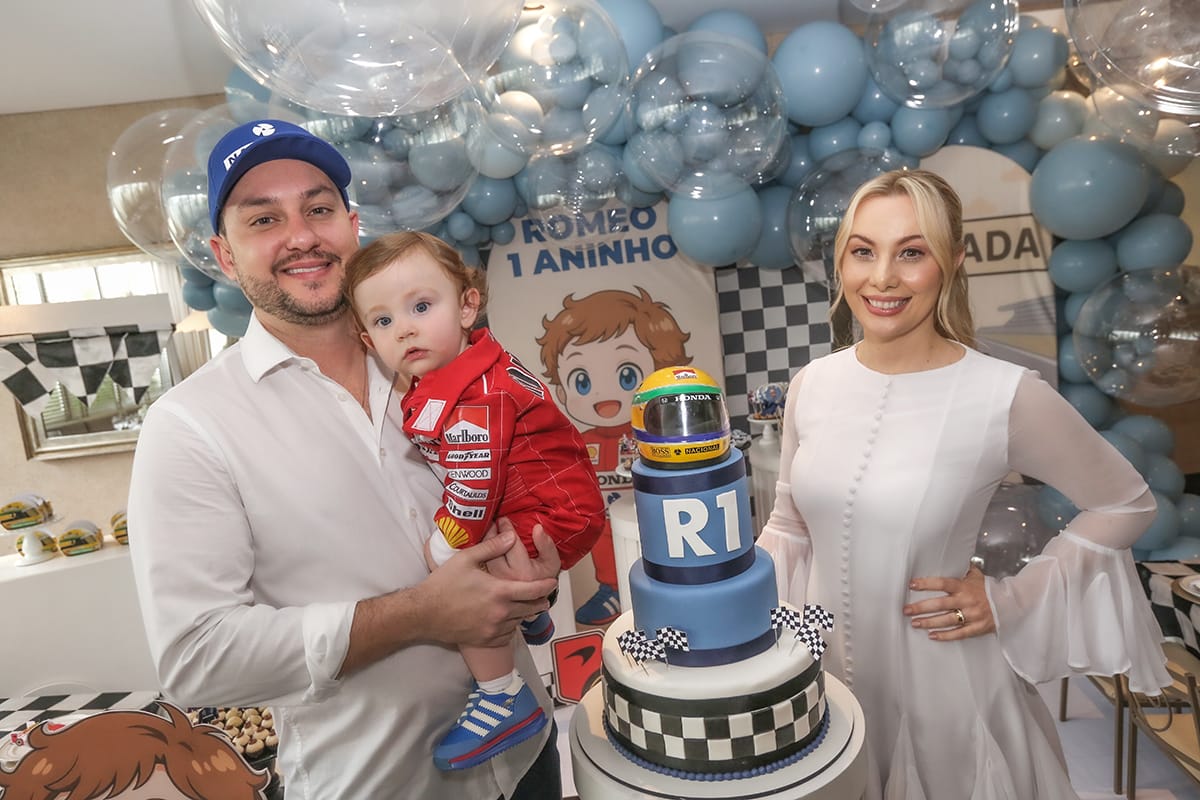 O luxuoso Ibiza Towers, em Balneário Camboriú, foi palco da comemoração do primeiro aninho do Romeu, filho do jovem casal de empresários Izabele Cristine de Souza, brusquense, e Lindomar Luiz Junior, lagunense. Com decoração inspirada na Fórmula 1, a festa impressionou pelos detalhes criativos. O pequeno aniversariante encantou os convidados vestido a caráter, com um macacão de piloto. (Foto: Darline e Angelo Fotografia)