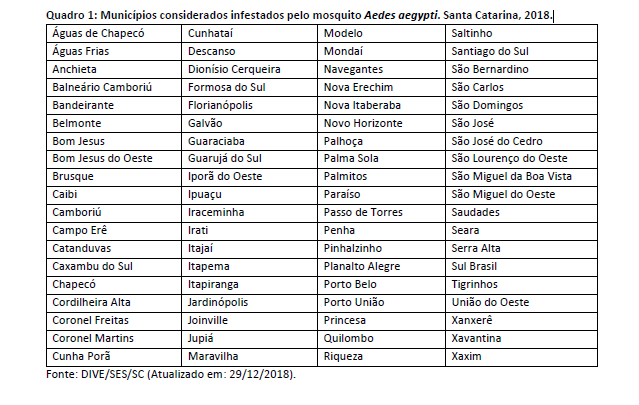 Quadro 1: Municípios considerados infestados pelo mosquito Aedes aegypti. Santa Catarina, 2018