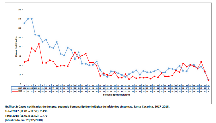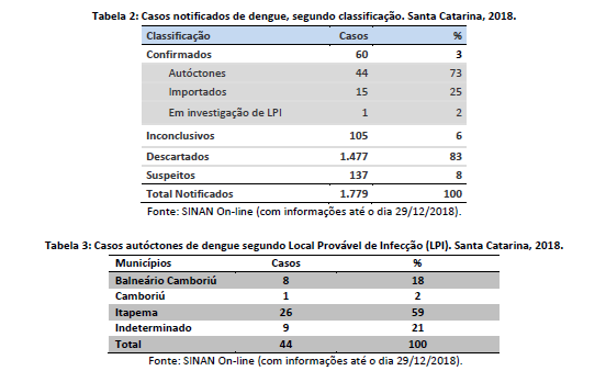 No período de 31 de dezembro de 2017 a 29 de dezembro de 2018, foram notificados 1.779 casos de dengue em Santa Catarina. Desses, 60 (3%) foram confirmados (todos pelo critério laboratorial), 105 (6%) estão inconclusivos (classificação utilizada no SINAN para os casos que, após 60 dias da data de notificação, ainda não tiveram sua investigação encerrada), 1.477 (83%) foram descartados por apresentarem resultado negativo para dengue e 137 (8%) estão sob investigação pelos municípios, conforme a Tabela 2.