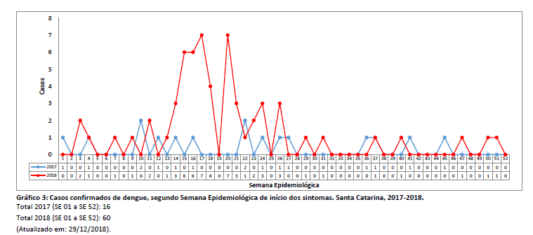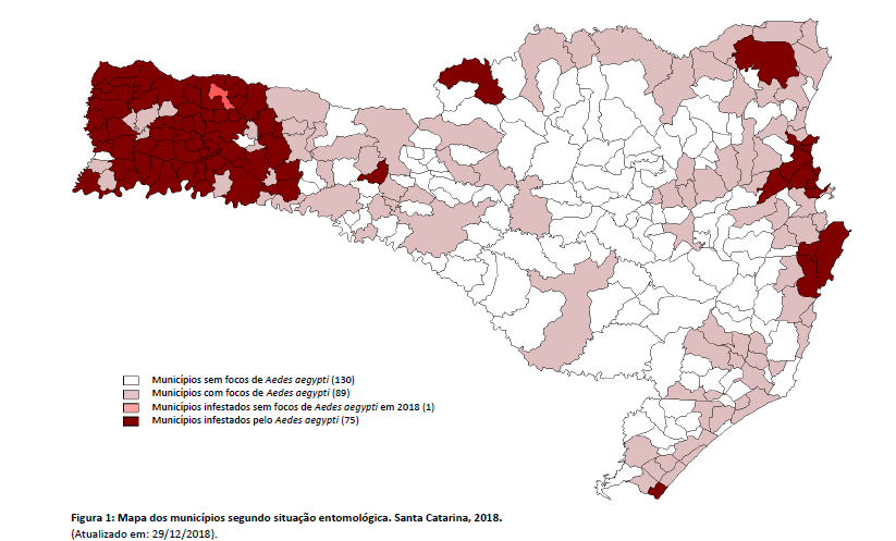 A Diretoria de Vigilância Epidemiológica de Santa Catarina (DIVE/SC) divulga o boletim n° 25/2018 sobre a situação da vigilância entomológica do Aedes aegypti e a situação epidemiológica de dengue, febre de chikungunya e zika vírus, com dados até a Semana Epidemiológica (SE) n° 52 (31 de dezembro de 2017 a 29 de dezembro de 2018).