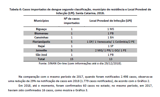 Os 15 casos importados (transmissão fora do estado) residem nos municípios de Biguaçu, Blumenau, Canoinhas, Florianópolis, Itajaí, Joinville e São José, de acordo com a Tabela 4. Em relação aos casos autóctones, o Laboratório Central de Saúde Pública (LACEN) conseguiu identificar o sorotipo em 21 amostras, sendo em dez (10) o DENV-1 e em onze (11) o DENV-2.