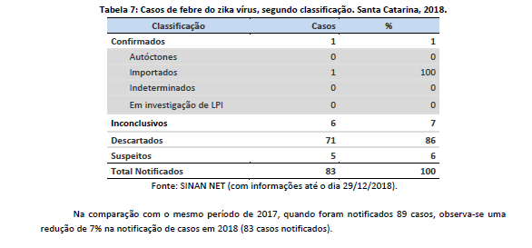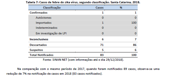 No período de 31 de dezembro de 2017 a 29 de dezembro de 2018, foram notificados 83 casos de zika vírus em Santa Catarina, sendo que 71 casos (86%) foram descartados, 5 (6%) permanecem como suspeitos e 6 (7%) como inconclusivos, conforme Tabela 7. Até o momento, o único caso confirmado é importado, com residência no município de Piratuba, e tem o estado do Mato Grosso como Local Provável de Infecção (LPI).