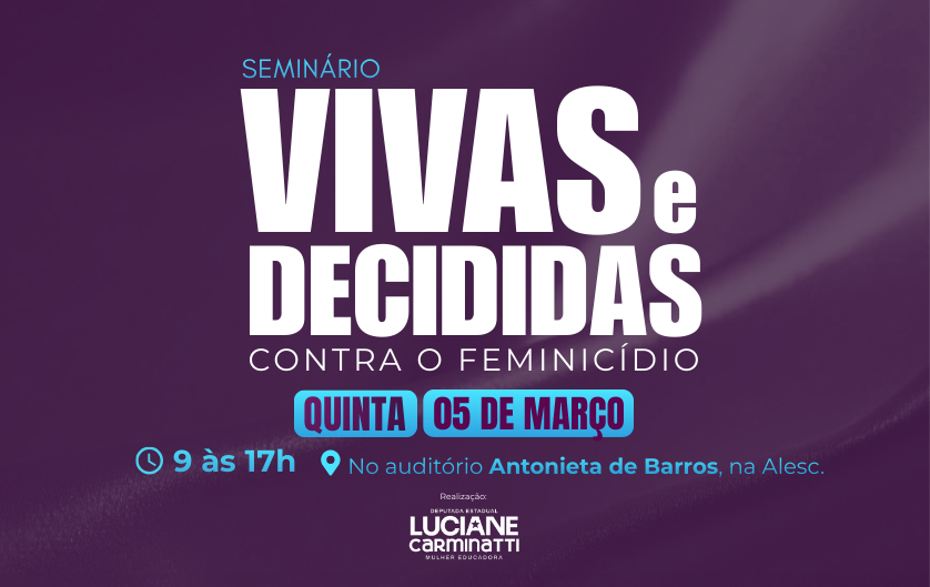 Diante desse cenário, a deputada estadual Luciane Carminatti (PT) realiza no dia 5 de março, na Assembleia Legislativa de Santa Catarina, o seminário “Vivas e Decididas - contra o feminicídio”, um ato de denúncia, cobrança institucional e mobilização social contra o feminicídio.