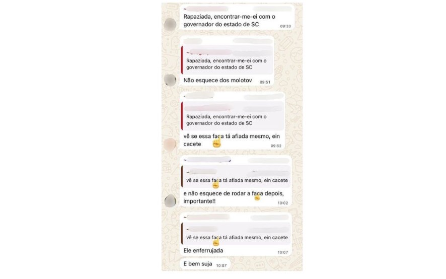As investigações tiveram início após a identificação de mensagens em um grupo de WhatsApp, nas quais os suspeitos discutiam usar uma “faca enferrujada e suja” e até coquetel molotov para atingir o governador. Um dos envolvidos chegou a afirmar que pretendia se encontrar com Jorginho Mello em Benedito Novo, no Vale do Itajaí, na quinta-feira (11), durante agenda do governador para inaugurar a nova quadra poliesportiva coberta da Escola de Educação Básica Leopoldo Koprowski.