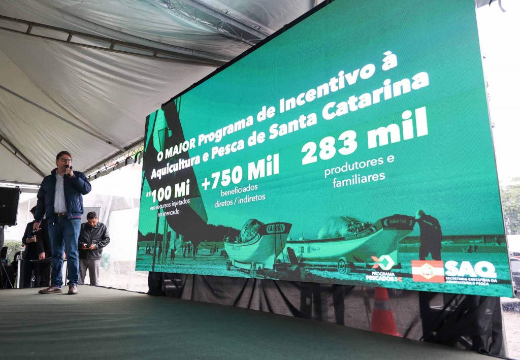 Santa Catarina dá um passo inédito para o fortalecimento da pesca e da aquicultura com o lançamento do Programa Pescados SC, apresentado pelo governador Jorginho Mello nesta segunda-feira (30), em Florianópolis. Considerado o maior pacote de ações já implementado no setor no estado, o programa reúne investimentos e financiamentos que somam R$ 100 milhões, com impacto direto em mais de um milhão de pessoas, entre pescadores, aquicultores, familiares e consumidores.