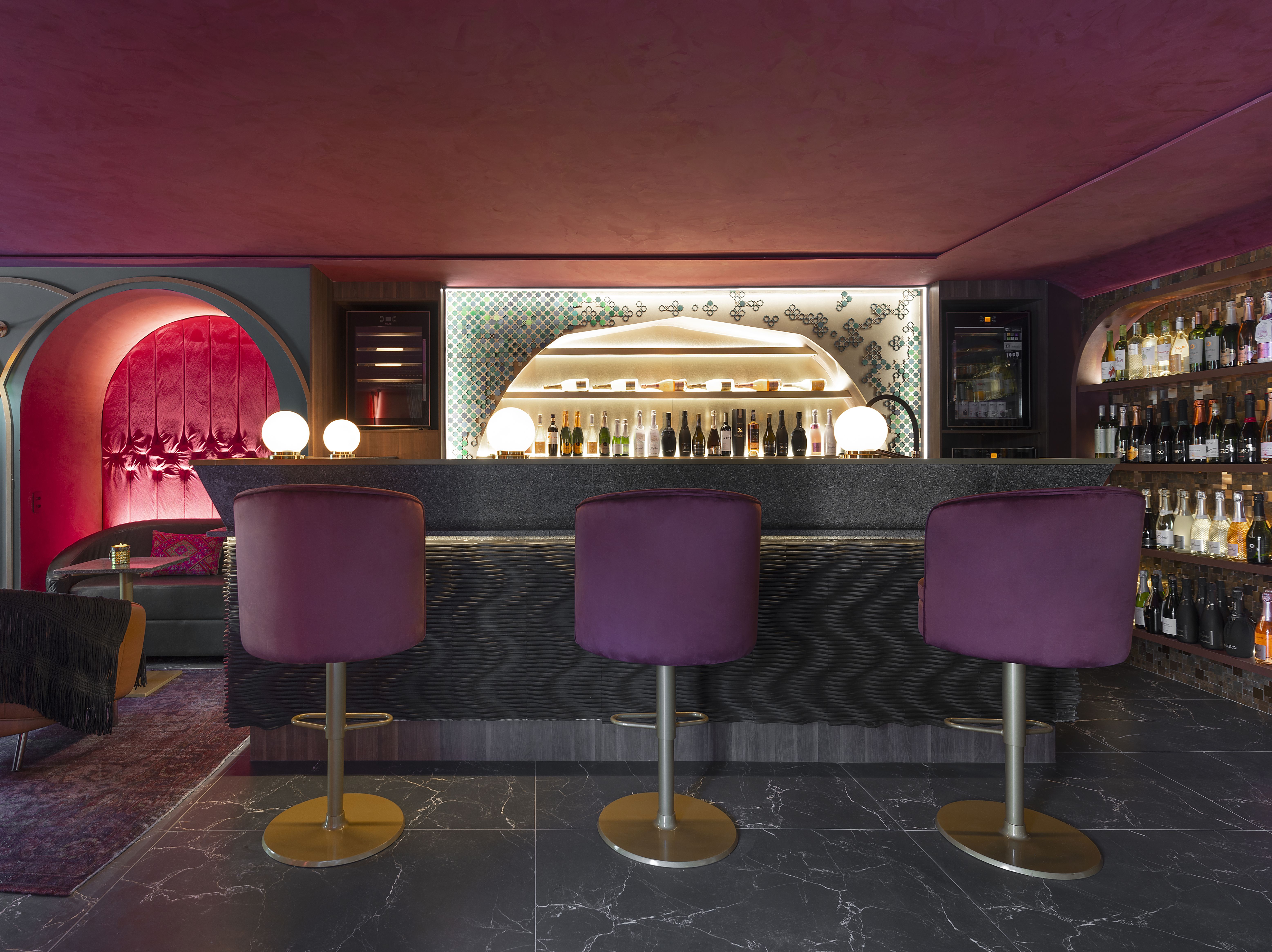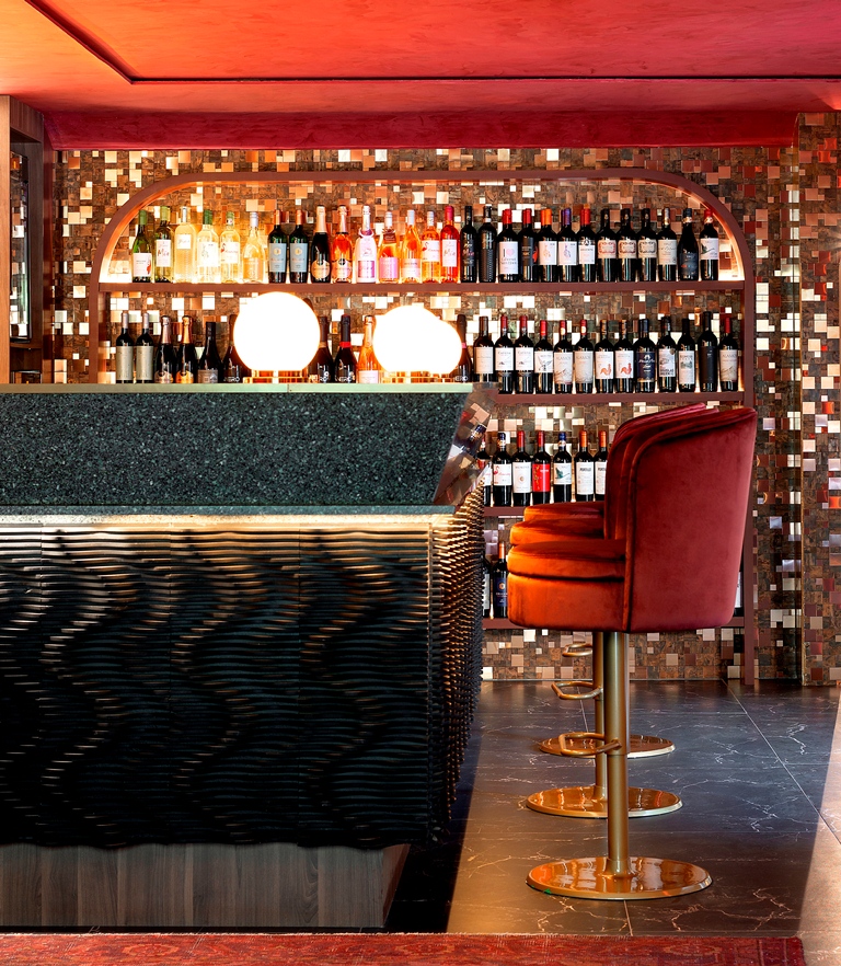 Os 50m² do ambiente foram recheados com detalhes minuciosos em uma viagem imersiva àquela que é conhecida como a Paris do Saara. A elegância da capital francesa também faz parte da inspiração para o wine bar. Ao primeiro impacto, o teto e as paredes receberam uma versão exclusiva e sofisticada da cor vinho em efeito cimento queimado, assinada pelas tintas Coral.