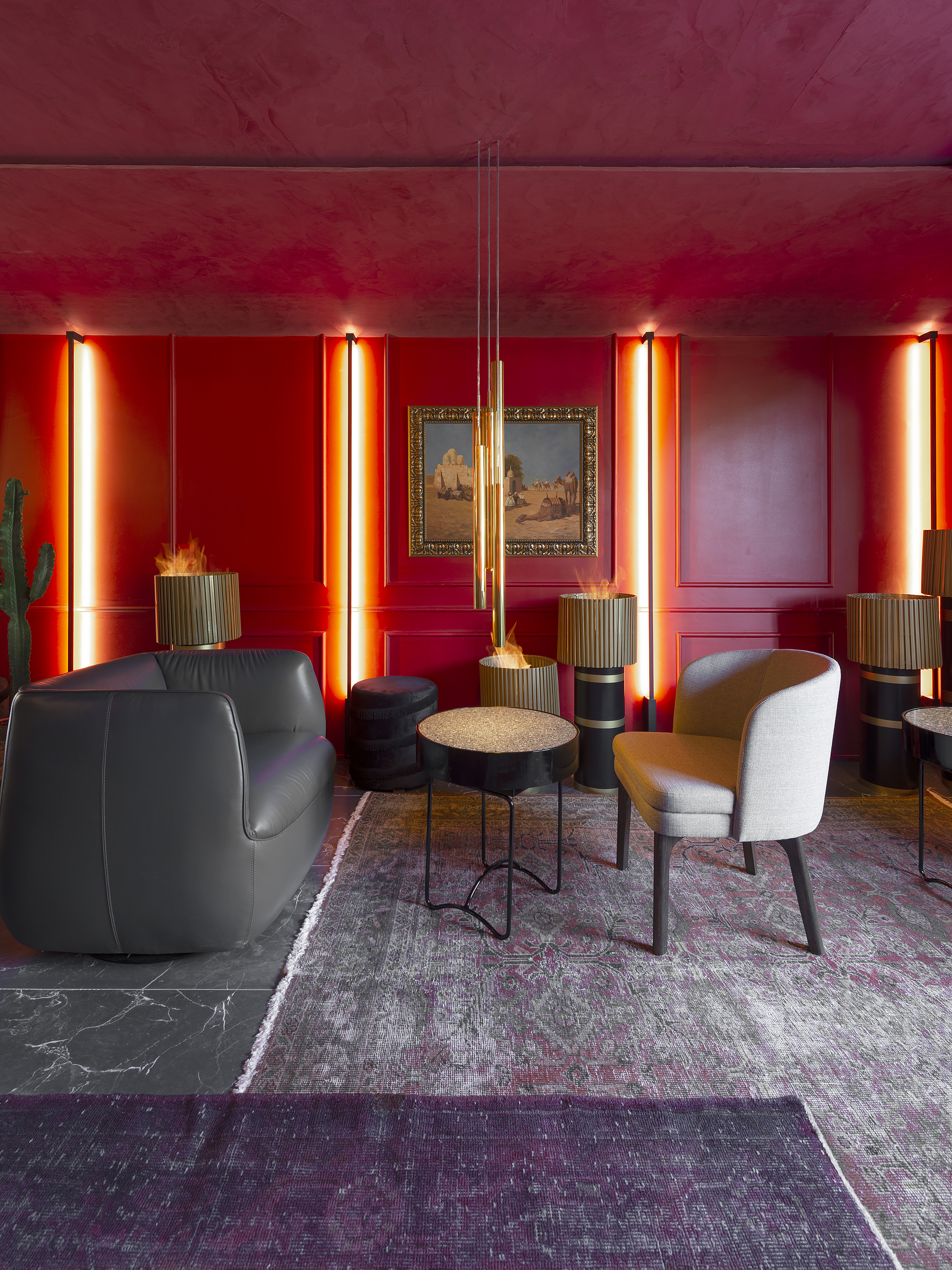 Completando o wine bar, a outra área criada pela designer de interiores contempla uma lareira decorativa entalhada a mão. Para o projeto luminotécnico, Alessandra Casagrande se juntou ao prestigiado escritório de iluminação NTZ Iluminação. Desta parceria, surgiu a síntese da luminosidade que se buscava para entregar a atmosfera pensada pela designer: “Procuramos descentralizar a iluminação, saindo do óbvio. Acostumamos a pensar a iluminação sempre com base no teto, porém, em Pra Lá de Marrakech buscamos variações na colocação das luminárias, utilizando as paredes e deixando o teto limpo. Construímos um ambiente sem nenhum embutido no teto, apenas pendentes. Para isso, usamos as luminárias da IluminaMundo, charmosas como os belos bistrôs parisienses”, destaca.