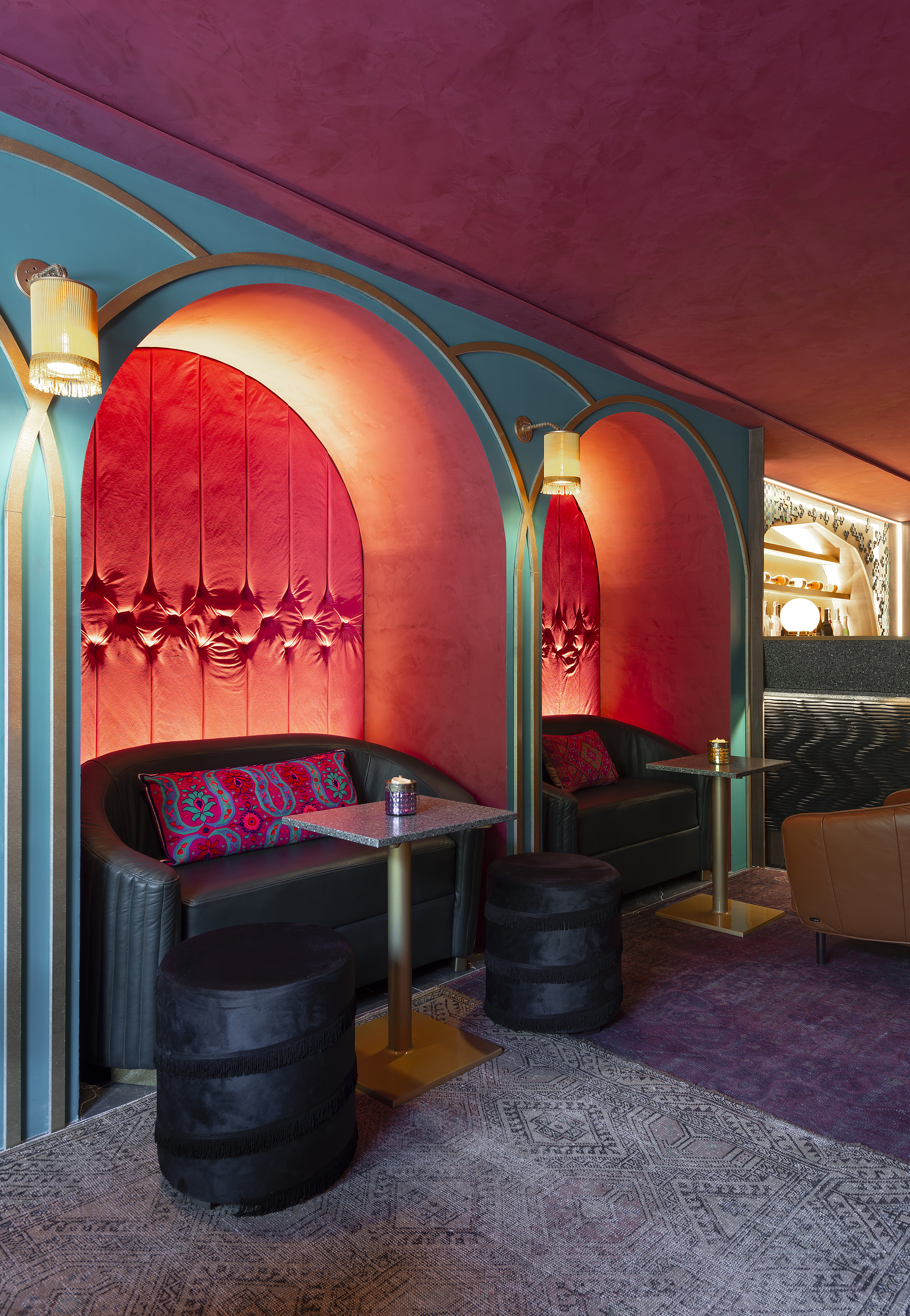 A influência oriental aparece em outros espaços de convívio e degustação da bebida. Alessandra criou arcos retratados nas aberturas do ambiente e nos nichos estrategicamente criados para o afastamento social exigido no momento. São também da mente criativa da designer a concepção dos sofás de couro tingidos de verde. Outra característica forte da arquitetura marroquina - sempre belíssima nas casas de chás e nos riads, por exemplo -, o rendilhado está presente nas cortinas que, ao contrário da forma como usamos, para barrar a iluminação, servem como divisórias de ambientes. Clássico dos clássicos nas compras pela medina, os tapetes orientais fortalecem ainda mais a essência do projeto. Com presença marcante no bar está um painel com Zellige, revestimento tão expressivo da cultura marroquina com uma leitura desconstruída, contemporânea e ocidental.