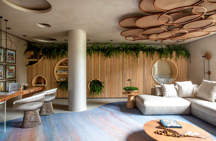 À primeira vista, ao entrar no espaço, atrai o olhar a marcenaria que veste uma parede lateral inteira. Desenho da arquiteta, o móvel feito com ripas de madeira natural Tauari, é resultante de manejo sustentável. Outra peça singular é a mesa do escritório, com um tampo feito a partir de uma tora de Imbuia, e pés em acrílico. A madeira é 100% resíduo encontrado na natureza, que foi ressignificado e transformado em uma obra de arte funcional e estética.