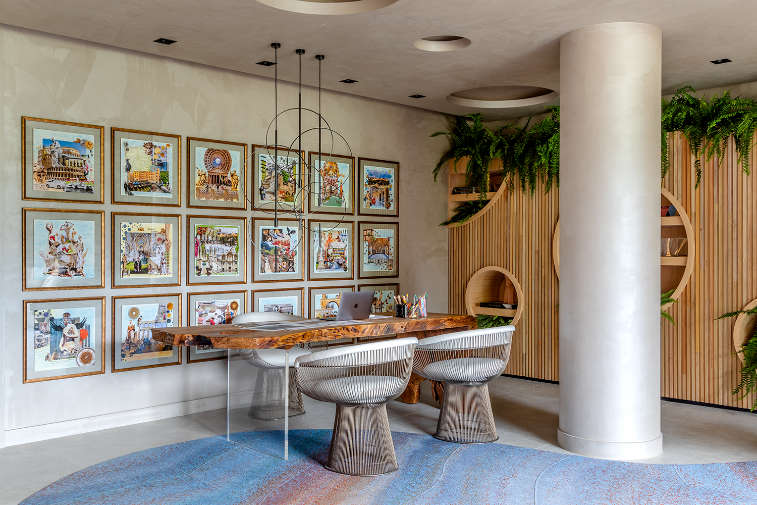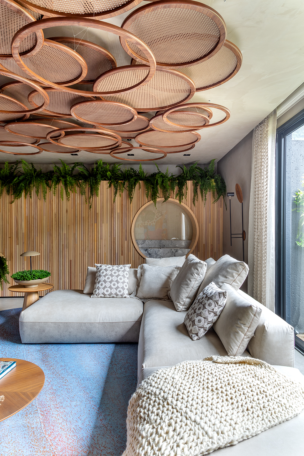 Quem conhece e acompanha o trabalho de Anna Maya sabe que as bolas - elemento geométrico circular - são marca registrada, quase que uma assinatura nos projetos da arquiteta. Na Sala Íntima elas não poderiam faltar. Aparecem em diferentes soluções, nos nichos do painel feito de ripas - onde de um lado servem de apoio para o home office e, do outro, abriga uma lareira ecológica - no teto, com iluminação embutida ou com uma abordagem mais escultural, nos tecidos e nas obras exclusivas, feitas uma a uma, para compor a ambientação.