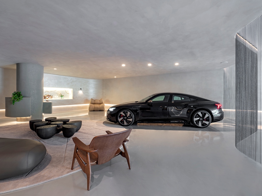 Além disso, o pilar retangular foi arredondado, criando um piloti modernista com prateleiras e uma decoração minimalista que reflete a organização e a pureza inerentes às personalidades exigentes e seletivas. Afinal, a estrela do espaço é o carro que atinge 646 cv e tem valor estimado em mais de R$ 1,1 milhão.