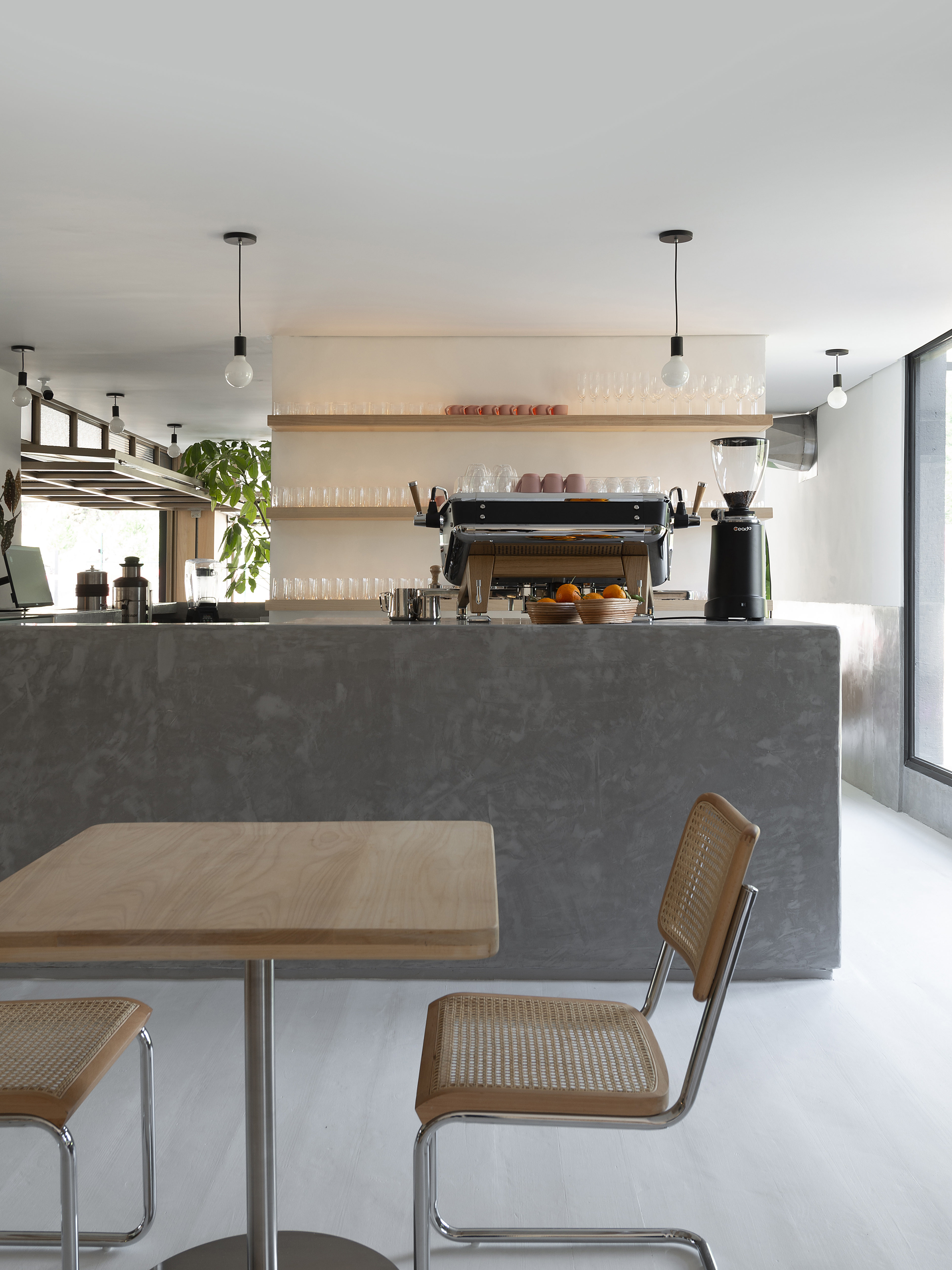 Outro elemento de destaque é o balcão do café, todo desenvolvido em concreto armado e com acabamento em cimento queimado da linha DECORA da Coral. Assim como o balcão, as paredes também foram revestidas à meia-parede com cimento queimado. Tudo na tonalidade Zepelim.