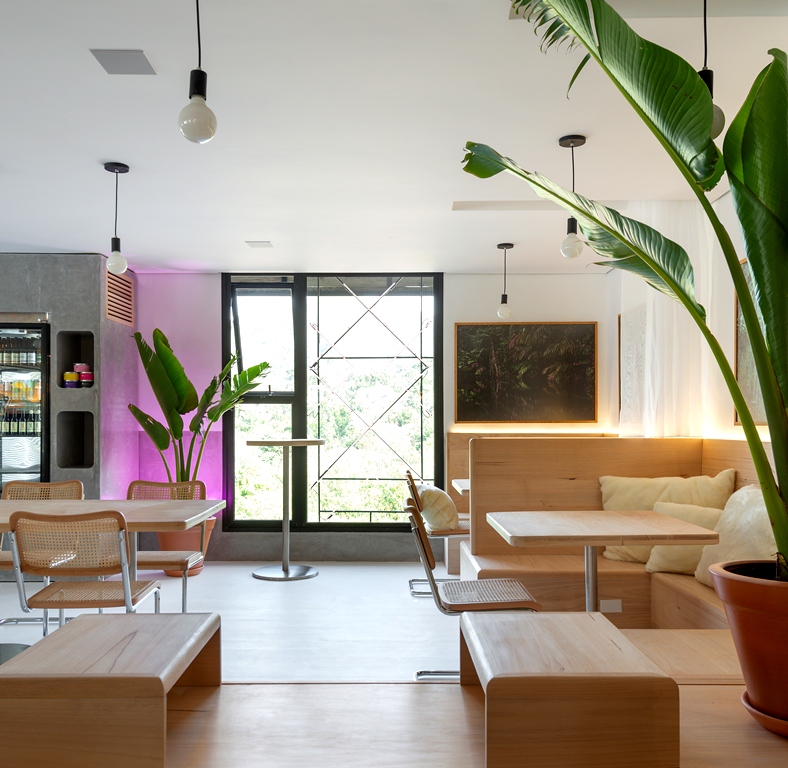 O uso de abundante vegetação nativa brasileira marca presença dando mais razão e personalidade ao espaço, o verde também é exaltado na série de imagens do fabuloso fotógrafo Matias Saufer, vindas diretamente de Berlim para o café. A cor cria seu manto por meio da luz neon, contribuindo com a ambiência agradável e experiência sensorial que a cor aditiva - a cor através da luz proporciona.