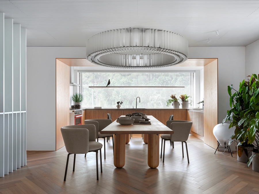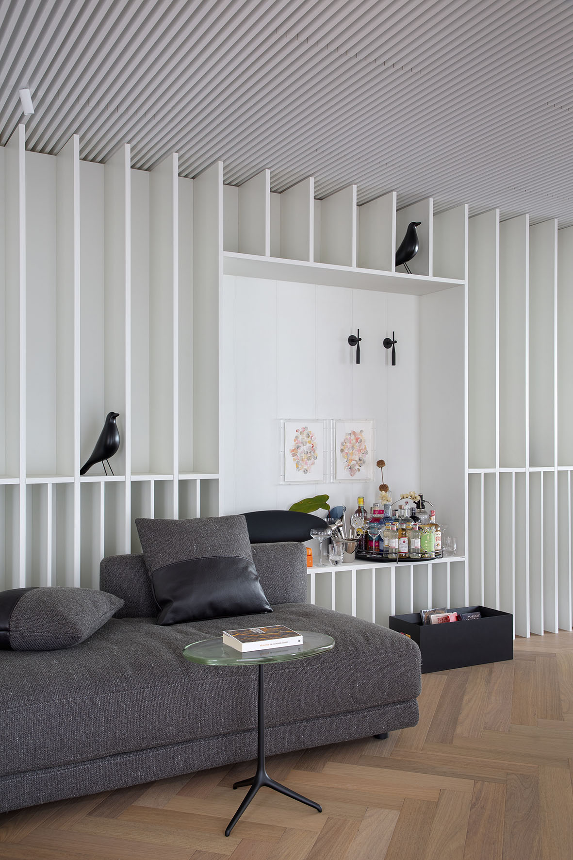 Destaque para a valorização da luz e sombra, traduzida nas paredes em ripas profundas estruturadas que abrigam as memórias da casa, dando a sensação do infinito “como um pássaro, buscando o horizonte”, entrega ele. Madeira, pedra, tecidos e fibras “aquecem” o espaço, aconchegando quem por ali passar e recebem lançamentos de cozinha da Florense e movelaria assinada pelo escritório, que ficam completos com a irreverente paginação do revestimento de piso e paredes ali aplicada.