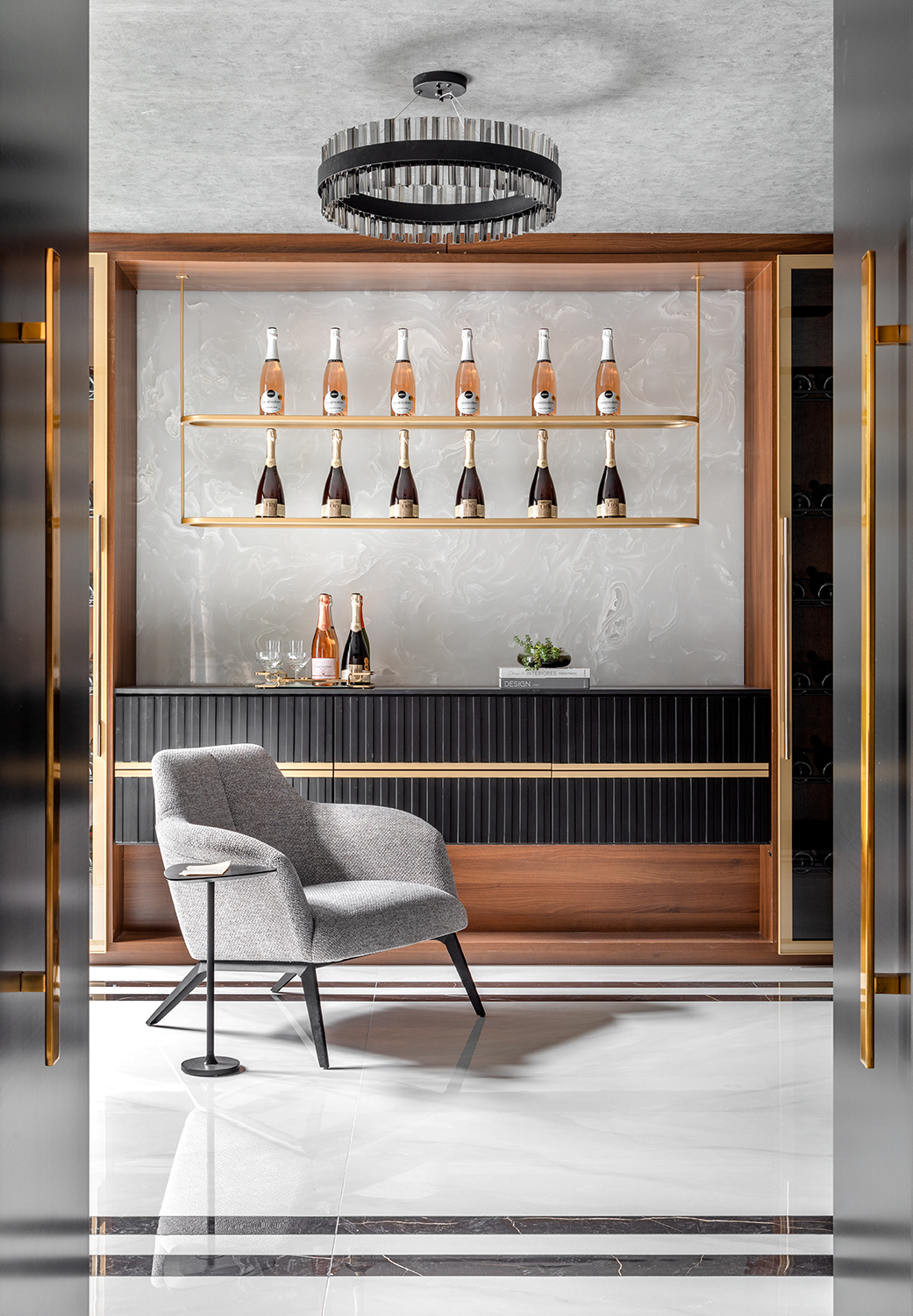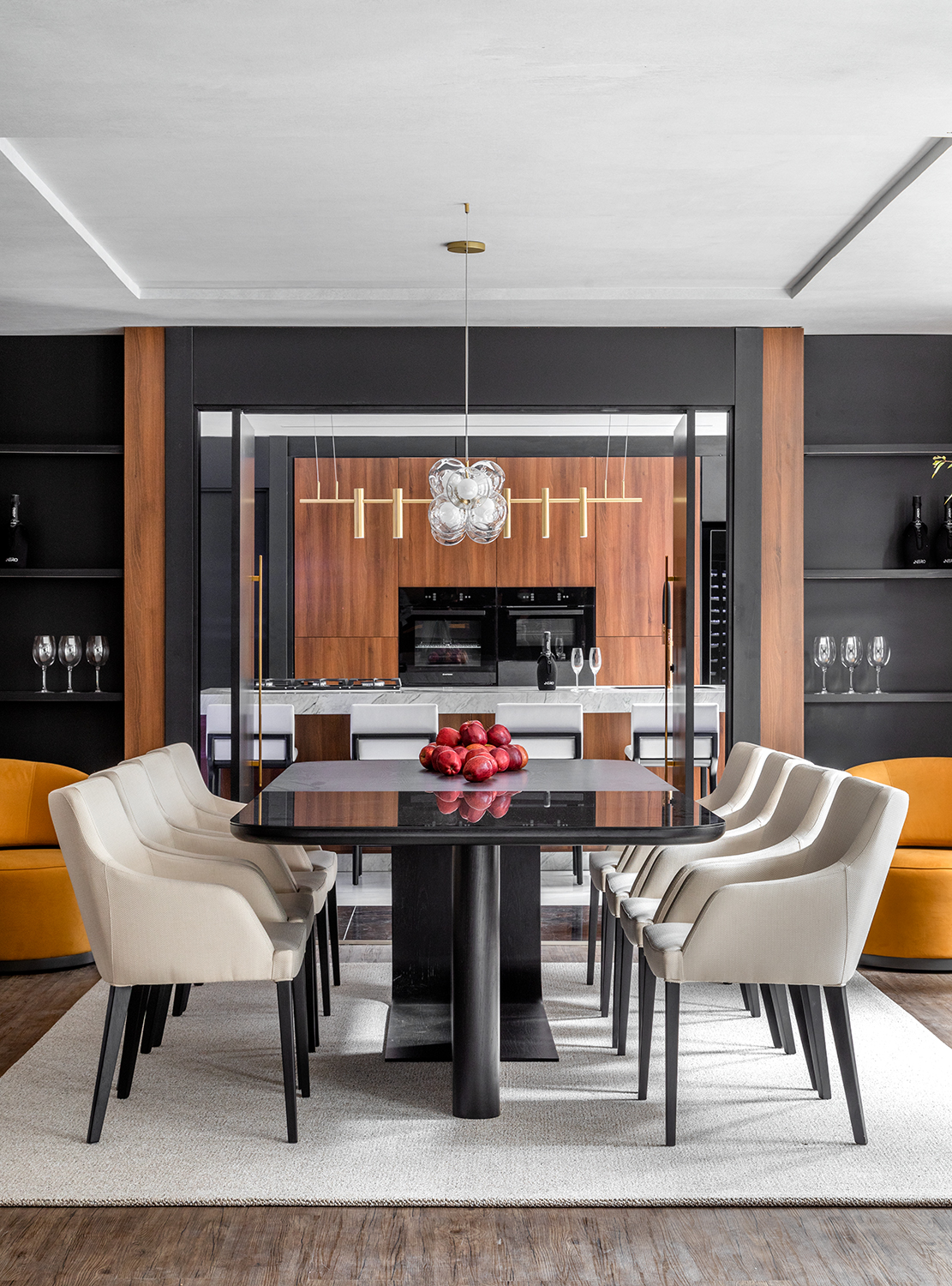 O espaço foi pensado pelos arquitetos para um morador que prioriza ambientes sofisticados, mas acolhedores, para viver e para compartilhar bons momentos com amigos, considerando que, em tempos de pandemia, a casa passou a ser o local dos encontros. O convidado inicia o percurso pela adega ou wine lounge. “Trata-se de um vestíbulo com espaço para harmonização, que recepciona o visitante, conduzindo-o para o estar/jantar integrados, ambiente de relaxamento e descontração”, revela Laís Forte. Em sequência, o visitante segue para a cozinha equipada, que pode ser integrada ou isolada dos demais ambientes a partir do fechamento das portas. “Existe uma ordem, hierarquia e fluidez, na qual a intenção é receber e celebrar com os convidados”, complementa Lucas Vitorino.