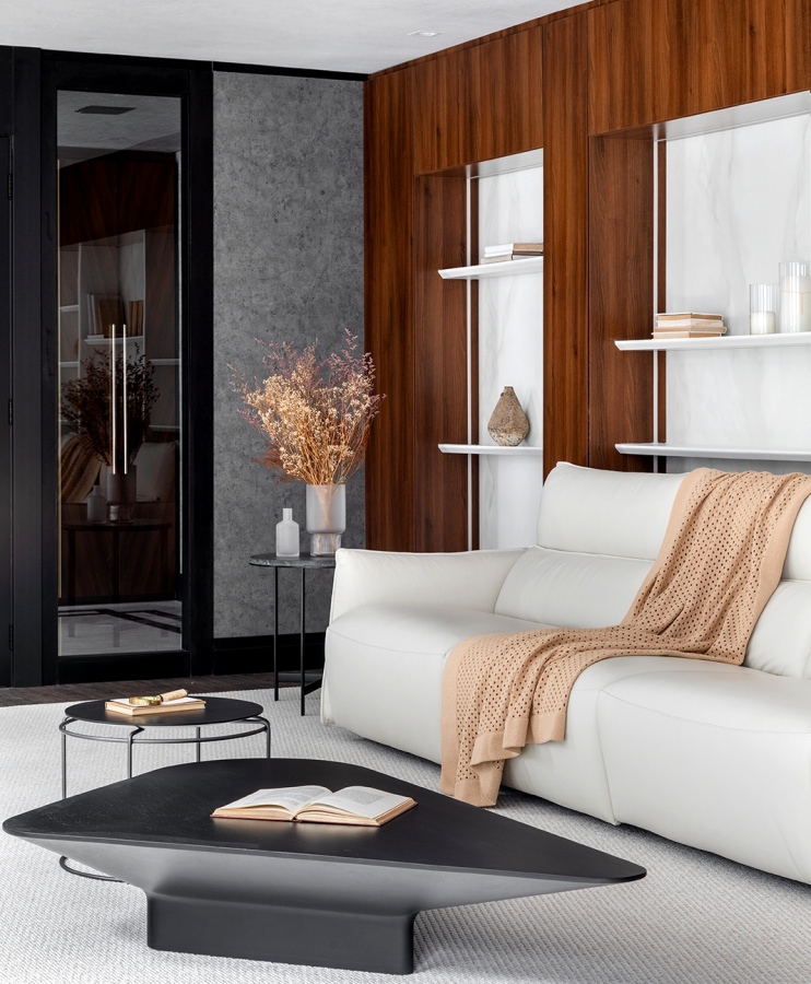 A arquitetura de traços requintados em linhas contemporâneas e acabamentos sofisticados conferem imponência ao espaço, que se revela acolhedor em função das soluções e elementos adotados. A paleta de cores contribuiu para proporcionar essa sensação de aconchego. Tons Off White e nuances escuras são bastante explorados nos ambientes, as quais mesclam com o amadeirado dos painéis e do revestimento de piso, que harmonizam e aquecem o espaço. Detalhes em dourado, metais, vidros, espelhos, couros, linho e marmorizado branco compõem o sofisticado conjunto.