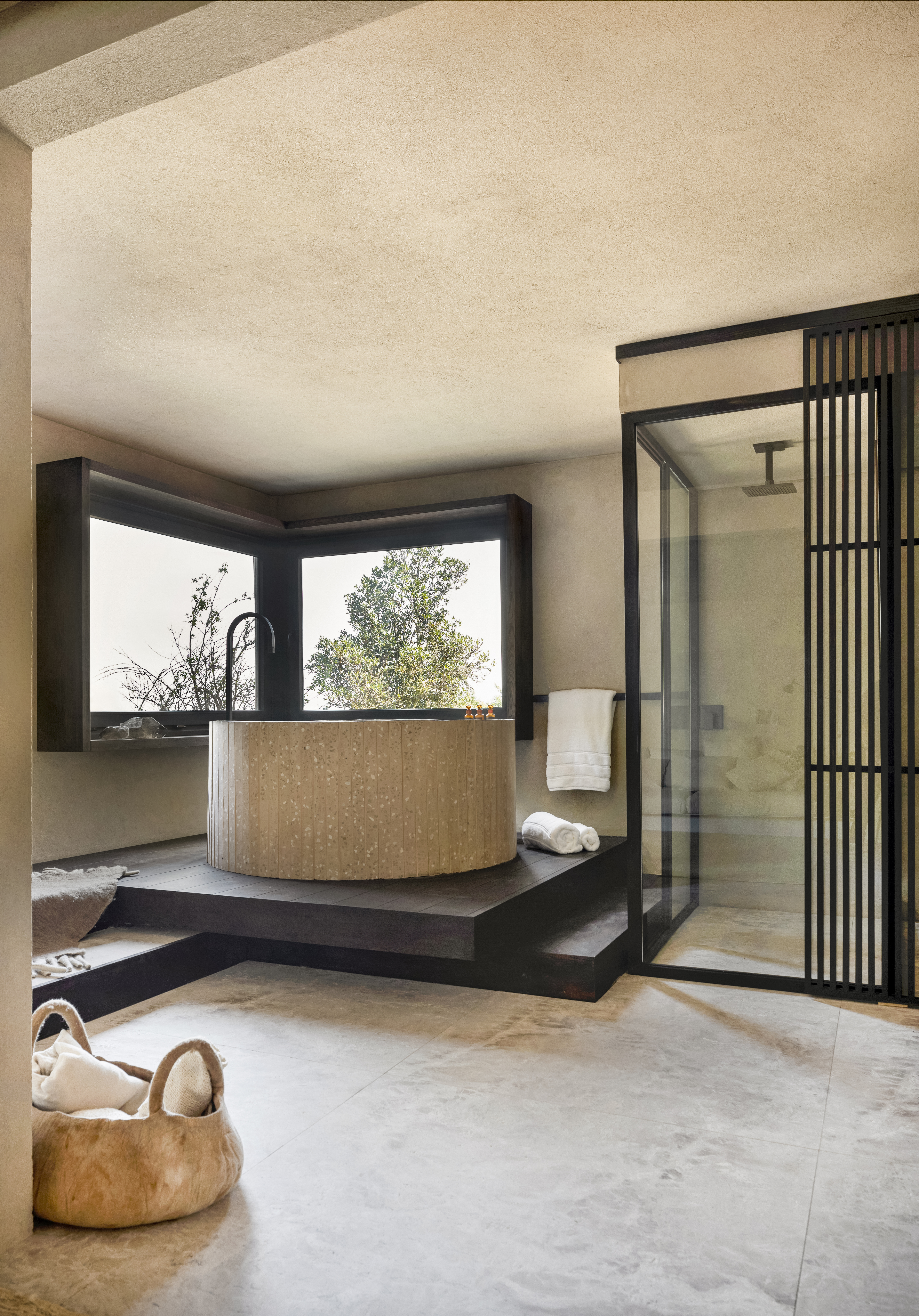 Onipresente e feito em carvalho europeu escurecido, o tablado interliga quase toda a suíte, possibilitando diferentes usos, do sofá à cama e ao banco, assim como apoio para a banheira, criada em granilite, material que nos últimos anos retornou aos projetos com majestade, e foi posicionada estrategicamente diante das janelas do antigo hotel. E para observar aquele que é considerado o pôr do sol mais bonito da Ilha, foram criadas molduras de madeira nas janelas, transformando a vista em obras de arte. A madeira também aparece no ripado que divide a área do banho e da bancada da pia. Para a profissional, "...traz conexão e conforto para as diversas situações de uso".