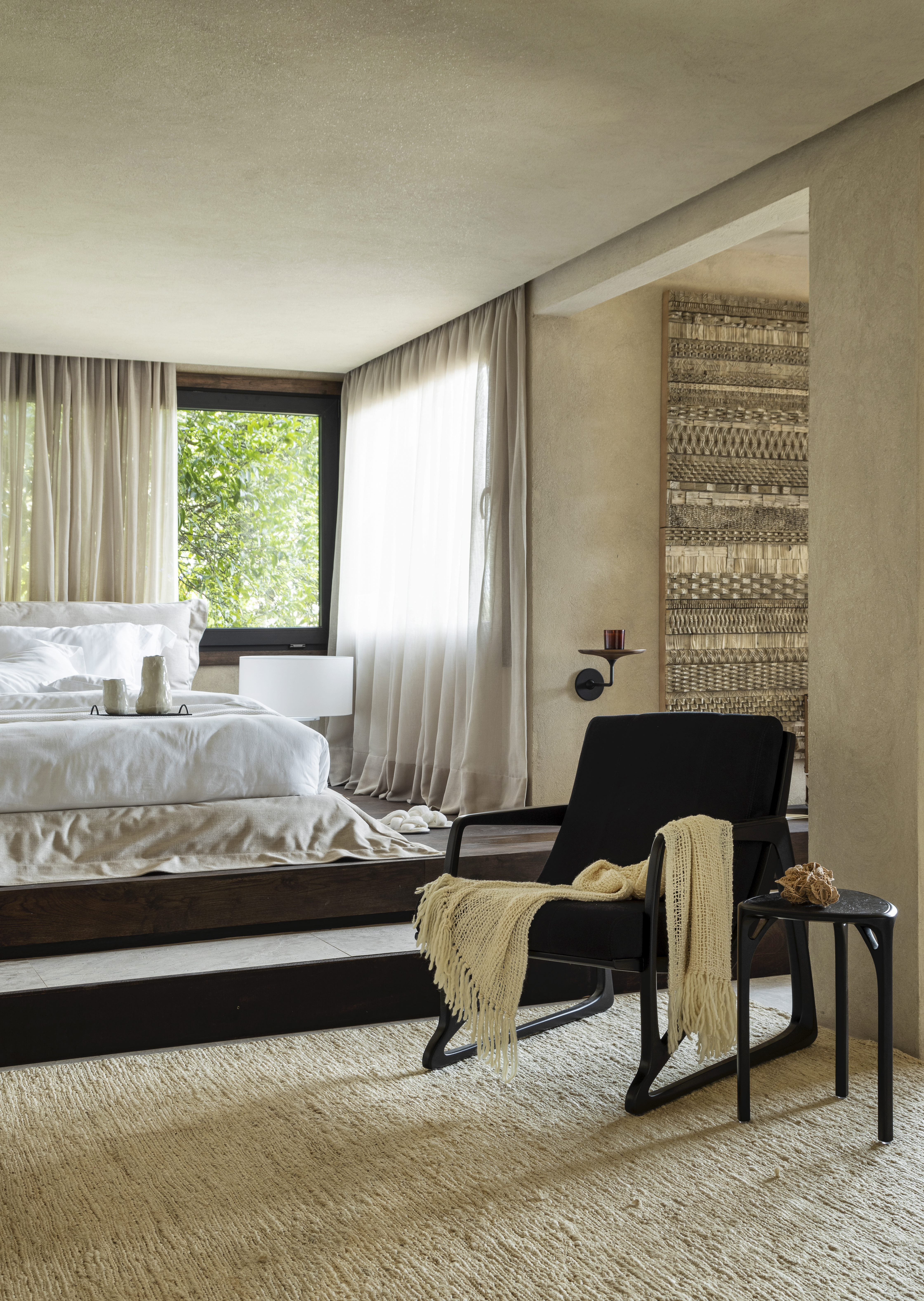 O aconchego do espaço inicia pela iluminação, apenas indireta e focal, realçando os materiais e as tonalidades, pensados para o descanso e a desconexão. Em sua maioria, os tons claros fazem contrapartida ao amadeirado e outros pontos de cores fortes, como a poltrona Lupita, de Aristeu Pires, o banco Matriz e a torre London, ambos de Jader Almeida. Andressa distribuiu tanto nas paredes quanto no mobiliário diversas cores que remetem às tonalidades da pele, reforçando ainda mais o conceito que denomina a suíte. No piso de mármore travertino bruto, da Ecco Conceito, a arquiteta apresenta mais uma textura nesta conexão do hóspede com a natureza.