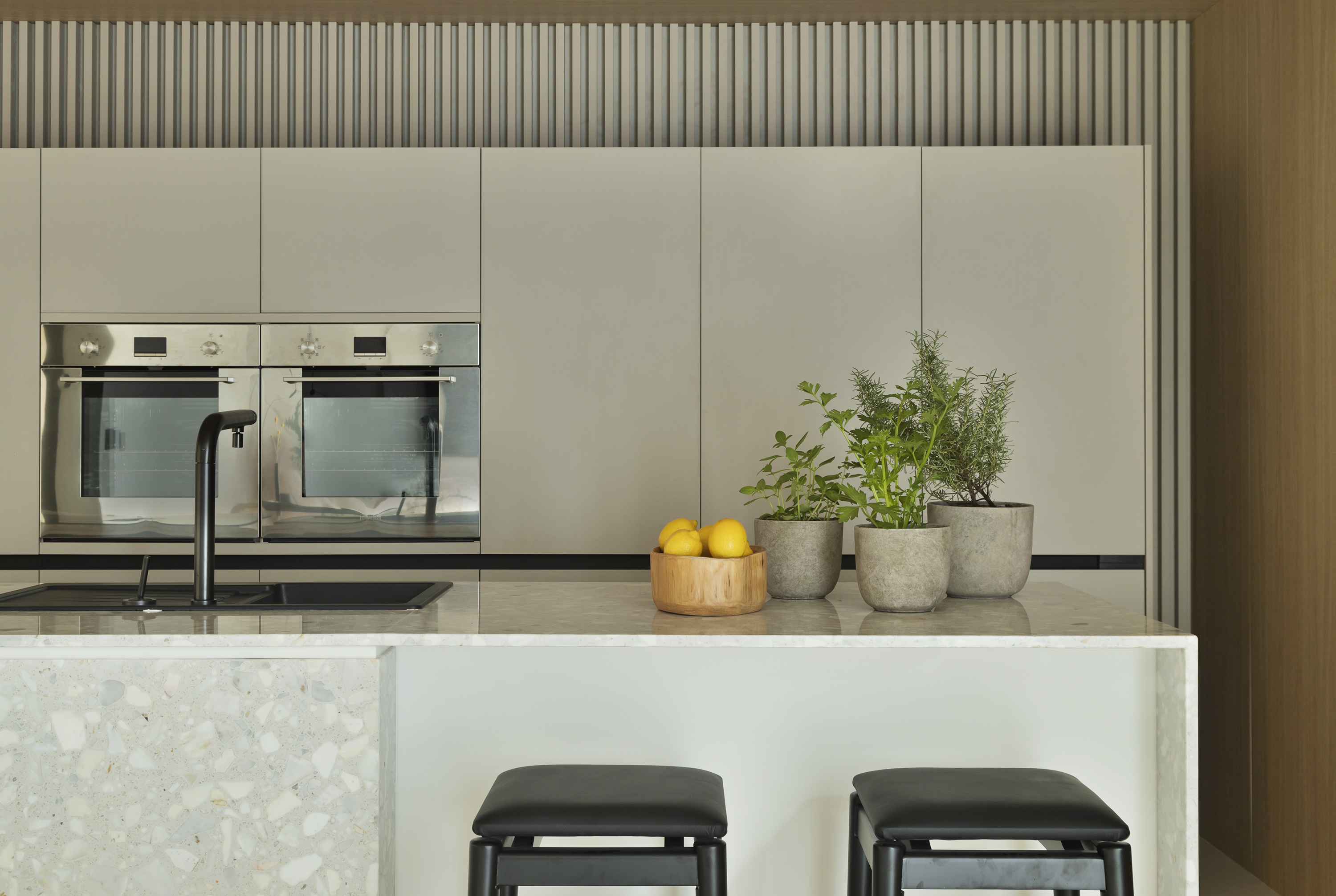 Batizado de RESPIRO, o living gourmet nasceu de uma homenagem de Mariana ao seu pai, que venceu a Covid-19, e voltou a encher os pulmões de ar, após ficar em coma por alguns dias em decorrência da doença. O ambiente traduz a interpretação pessoal da arquiteta sobre o significado de “respirar”.