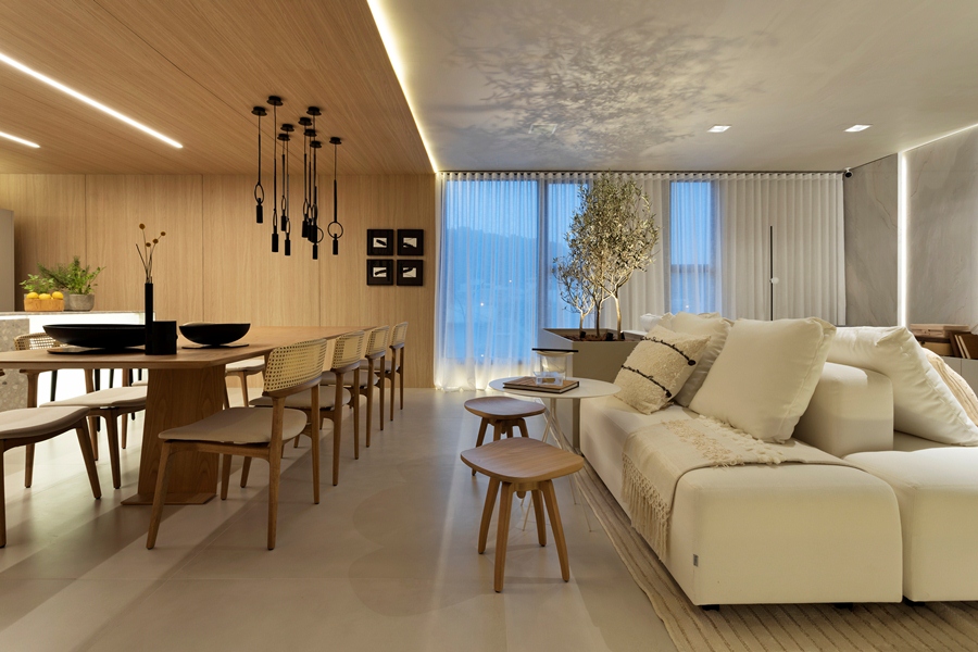 Com uma linguagem contemporânea, o espaço de 52m² foi pensado para o convívio entre familiares e amigos. Um ambiente integrado, sem excessos, que propicia conforto e sensação de leveza. A profissional explica que “ao buscar o fundamental, o minimalismo se materializa na presença de peças essenciais, linhas geométricas e cores neutras, onde aconchego e frescor se encontram”.