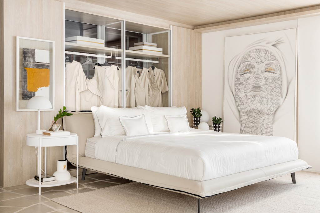 Já ao lado da cama da Natuzzi Italia, com o colchão da Reveev, repousa a obra Cosmopolitan, de Paulo Ricardo Campos, enquanto as esculturas de Marilene