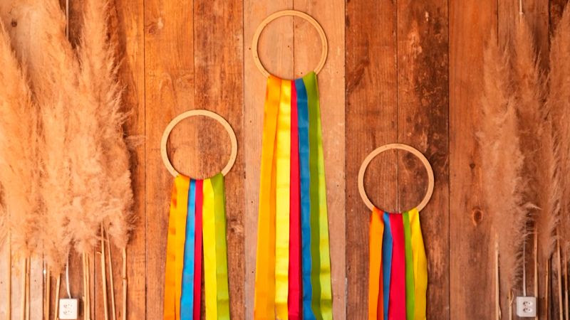 Enfeite para parede com bastidor e fitas coloridas