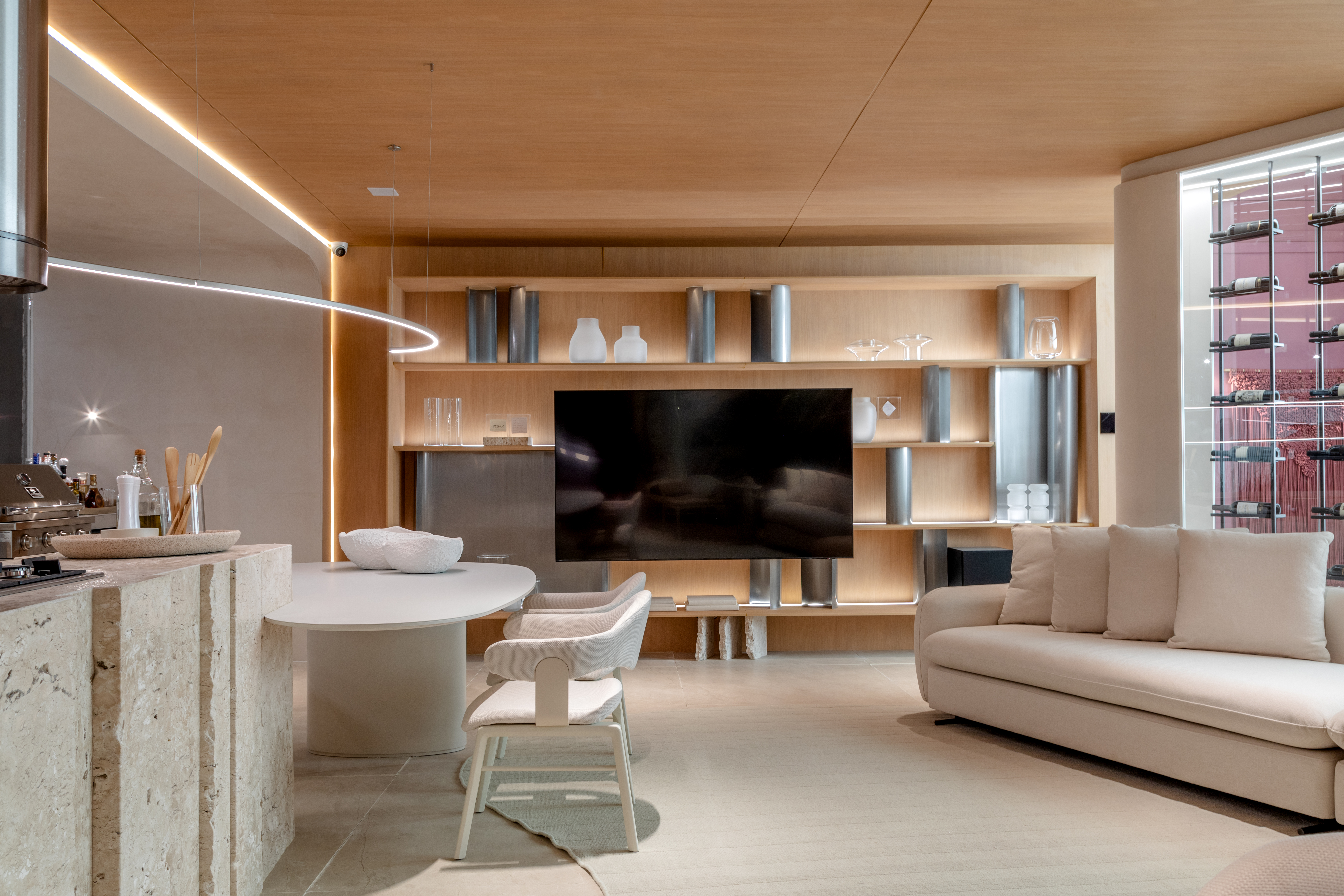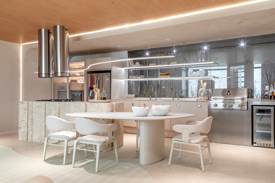 Ao adentrar o espaço gourmet projetado por Bia e sua equipe - no time são mais seis mentes femininas -, o visitante encontra a modernidade dos equipamentos, sejam eles para o bem-estar entre os convivas ou os eletrodomésticos, todos em inox, destinados à área gastronômica, em contrapartida com a escolha dos materiais. A bancada de mármore travertino brasileiro que abriga o cooktop foi esculpida de forma menos óbvia, resultando em uma peça de design exclusiva.