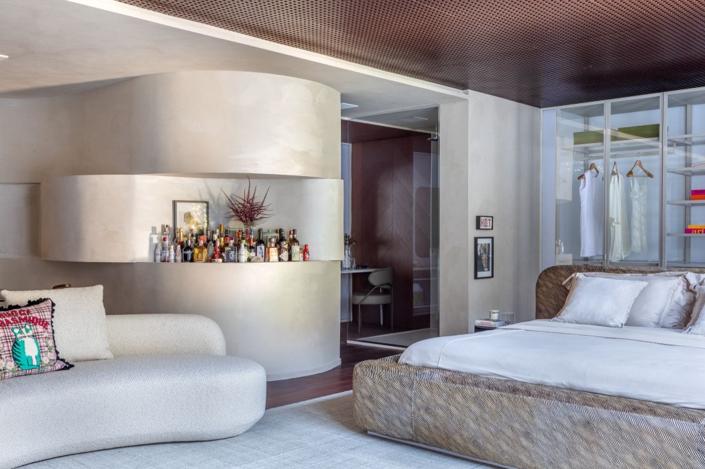O bar segue a linha curva da estante de bebidas, projetada do chão ao teto (Crédito Lio Simas)