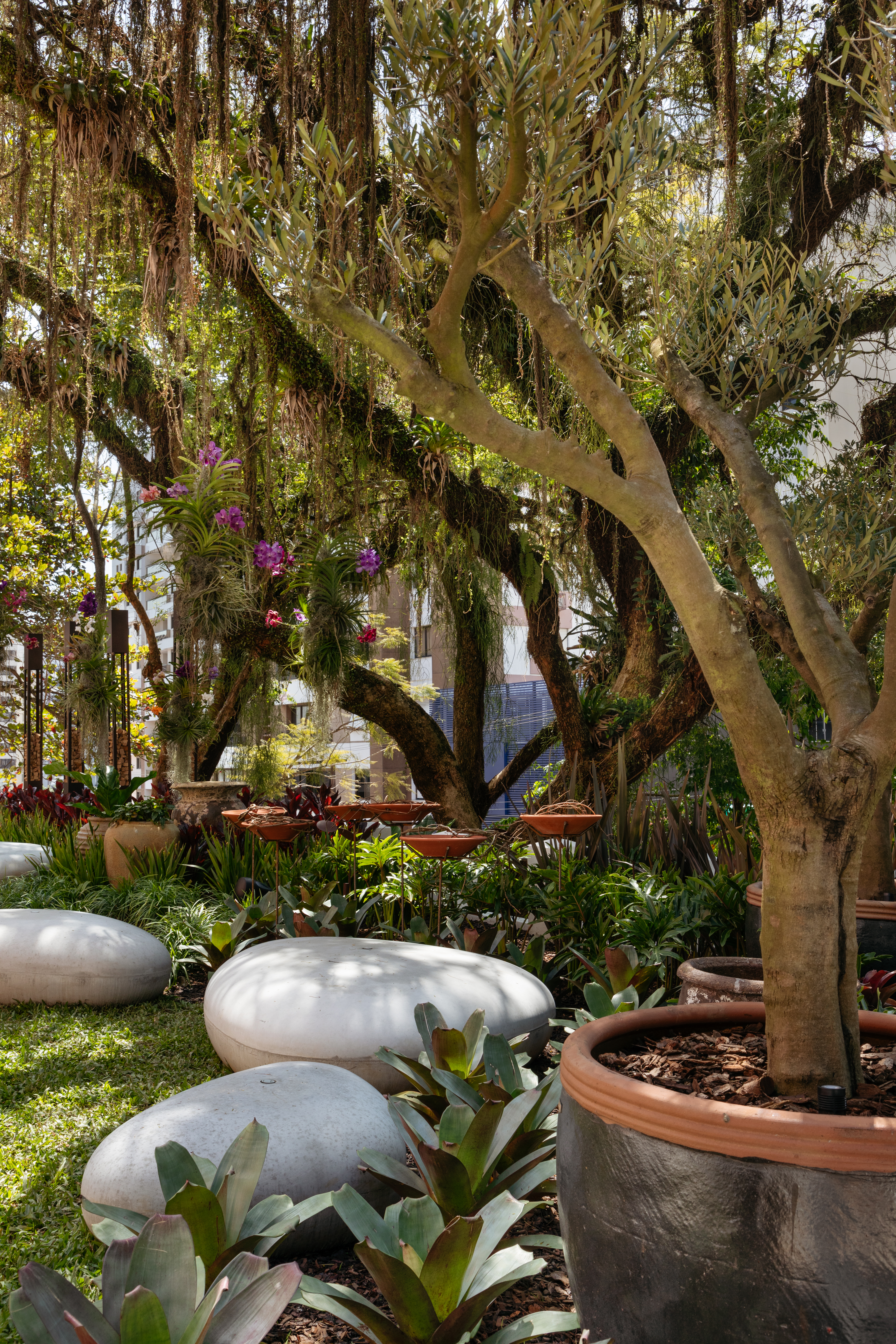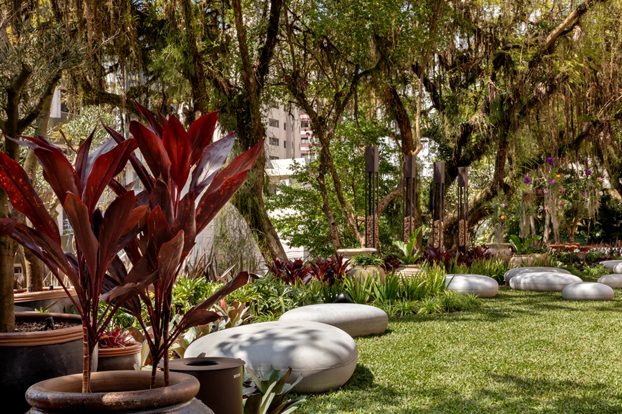 Todas as vegetações são pensadas para criar um efeito visual de leve contraste, inclusive as oliveiras que foram trazidas do Rio Grande do Sul com idade de 15 anos. Além dos tons de verde e rubro, a composição do jardim inclui vasos que invadem os canteiros e ganham destaque pelo belíssimo conjunto que formam. Os comedouros querem atrair a visita de pássaros e, como explica a arquiteta, as pedras stones lembram as de rio, formando um lindo conjunto pousado sobre a grama. “A ideia é convidar os visitantes a uma pausa, para contemplar o espaço e também desfrutar dos sons da cidade e da natureza”, finaliza.