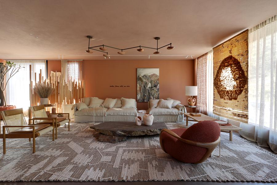 Camadas de cores e texturas que representam a diversidade do Brasil. Os tons terrosos aparecem em texturas e tramas por todo o espaço. A contar pelo teto tingido com a cor lançamento da Coral, batizada de “Camadas Brasileiras'', e utilizada como elemento de arremate e equilíbrio.