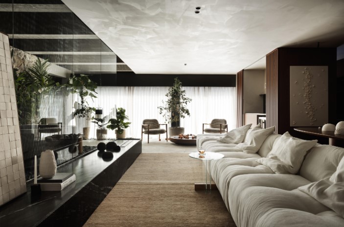 O ponto de partida para o living foi criar um espaço que funcionasse como um respiro dentro de casa, um lugar onde o tempo desacelera e a presença se torna prioridade. Assim, a paleta de materiais e texturas traz elementos naturais, como madeira, pedra, tecidos leves e superfícies orgânicas, que dialogam com a ideia de fluidez e acolhimento.