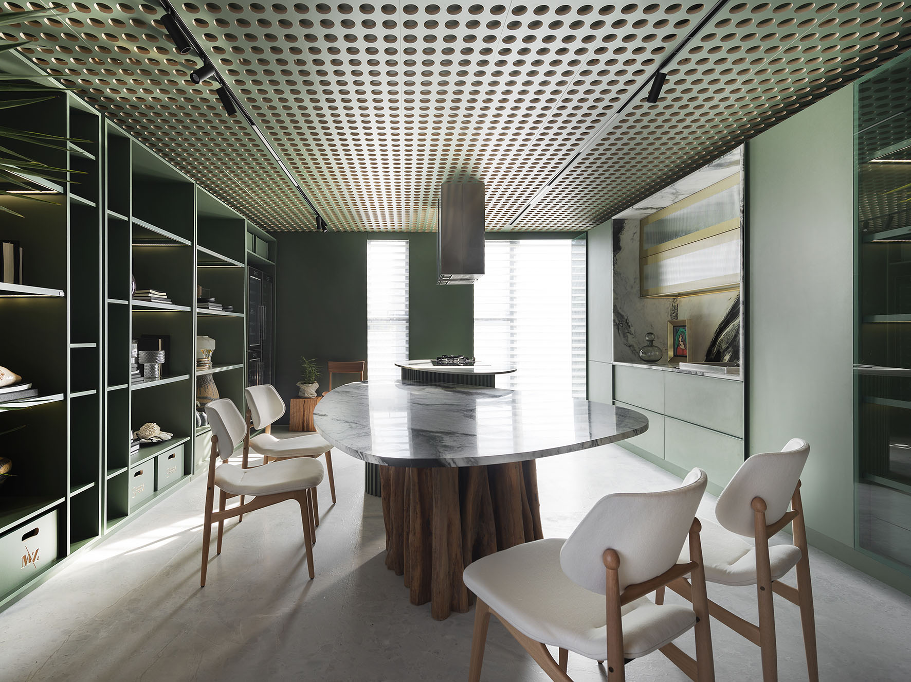 O ponto de cor mais forte no loft vem da cozinha, que deixa de lado somente a versão de serviço para funcionar também como um local de encontro e das reuniões virtuais do home office. Intenso e elegante, o verde Amazônia domina, principalmente, os espaços planejados que reúnem, mais uma vez, uma cuidadosa seleção de artistas visuais catarinenses. Como sua galeria pessoal, Michael reúne obras de nomes consagrados do porte de Eli Heil, Suely Beduschi e Vera Sabino a novos expoentes como Rodrigo Cunha, Elis Teixeira e Juliana Hoffman . A visão artística feminina de Sara Ramos e Jana Garcia também aparecem na curadoria. Ainda ali, diante se sua própria história, o arquiteto dispõe algumas peças de seu acervo pessoal. E mais uma vez o mármore se completa com o tronco de madeira sustentando a mesa com seus veios naturais.