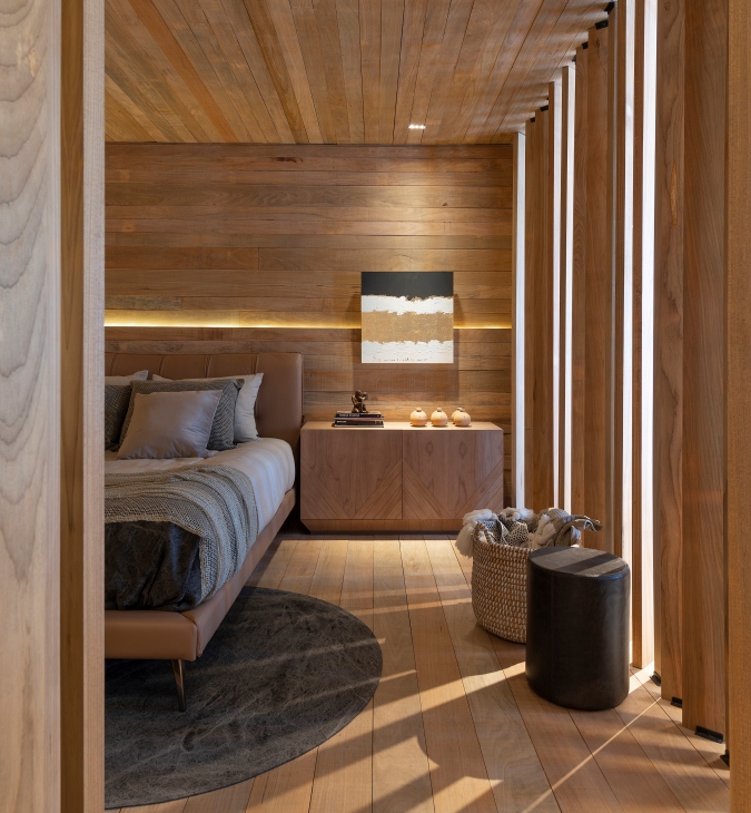 Material que o destacou na edição do ano passado no projeto Janelas CASACOR, a madeira protagoniza a suíte do loft de 80m², do chão ao teto. E ele resolveu quebrar o padrão ao preencher esta caixa: em estado natural, a madeira Tauari surge sem tratamentos ou procedimentos, executada de forma artesanal, única. O cheiro amadeirado no ar transporta a lembrança até as casas da infância, até o passado. Há um reconhecimento imediato de que, literalmente, se encaixaria em projetos de hotéis e casas de campo, onde conforto, elegância e natureza se entrelaçam.