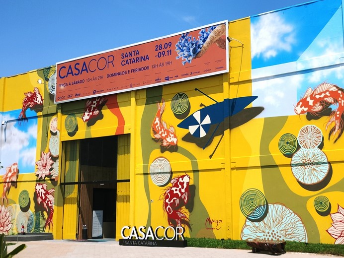 Quem chega à CASACOR SC | Florianópolis 2025 logo é surpreendido por uma pintura monumental que se destaca na fachada do ex-parque gráfico da NSC, em Capoeiras. Com 20 metros de largura por 9 de altura, o mural “As Carpas” é a nova criação do artista argentino Marcelo Urizar - que tem o nome artístico de Murizarte, e que há mais de uma década deixa sua marca em diferentes edições da mostra.
