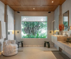A abertura da casa para o entorno se torna ponto-chave no projeto: a natureza envolve os ambientes internos, sem barreiras, criando espaços fluidos, versáteis e dinâmicos. As cores reforçam essa vitalidade nuances de areia, terracotas, laranjas e vermelhos que vibram junto ao piso monolítico, abraçando o ambiente em sua totalidade. A madeira, em suas diferentes expressões, aquece e acolhe, dando corpo a uma atmosfera singular.