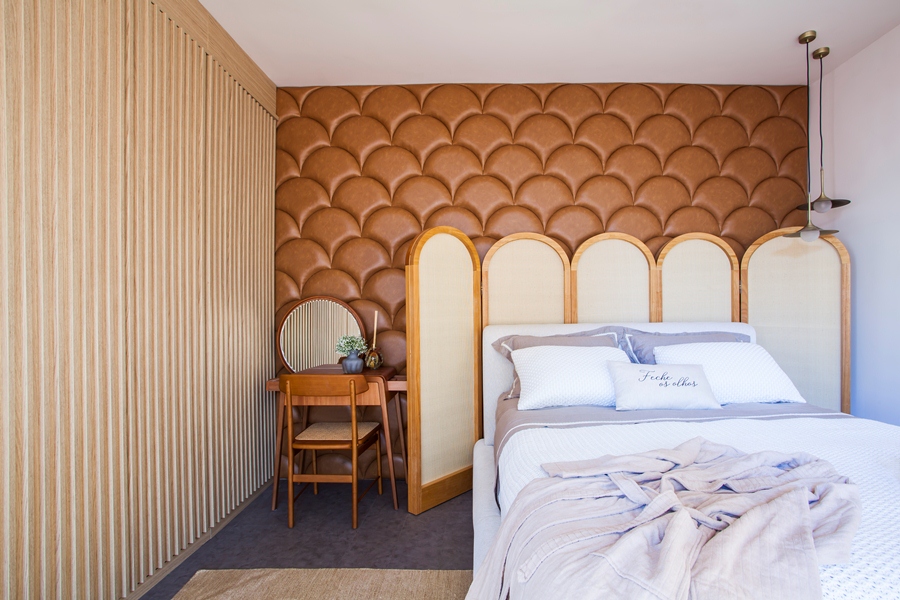 Independente do estilo ou tendências, conforto é o principal item quando se projeta um dormitório. Depois é só garantir que não seja um ambiente engessado, e sim em sintonia com a personalidade de quem vai ocupar o espaço. Na Suíte do Casal, assinada por Mariane Bassegio e Nando Machado, o contraste entre conceito urbano e a forma como a natureza complementa e acolhe é o destaque. Já na entrada do quarto, o closet numa versão desconstruída ganhou vida — não é só o lugar para guardar roupas e sapatos, mas também para estar, com objetos de decoração e de memórias.
